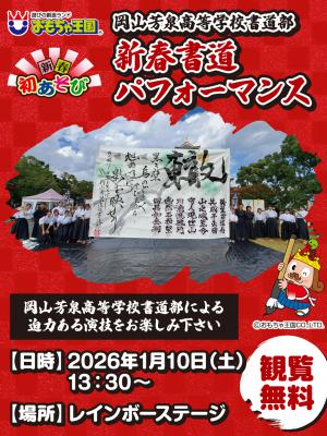 岡山芳泉高等学校書道部による迫力ある演技をお楽しみ下さい! 【開催日・場所】 2026年1月10日(土):岡山芳泉高等学校書道部 場所:レインボーステージ 【開催時間】 13:30~