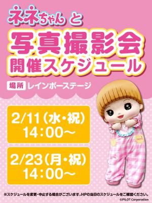 レインボーステージにネネちゃんが遊びに来るよ! いっしょにお写真を撮ってね♪ 【時間】 14:00~ 【場所】 レインボーステージ 【参加料】 無料 ※おもちゃ王国入園料は別途必要です。 ネネちゃんに会いにきてね!