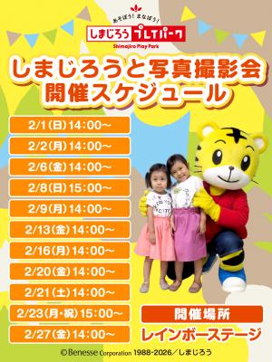 レインボーステージにしまじろうが遊びに来るよ! いっしょにお写真を撮ってね♪ 【時間】 15:00~ 【場所】 レインボーステージ 【参加料】 無料 ※おもちゃ王国入園料は別途必要です。 しまじろうに会いにきてね! ※撮影会のみとなります。ダンスなどのショーはございません。
